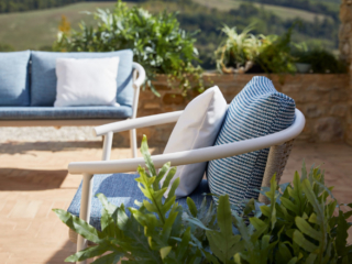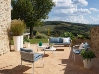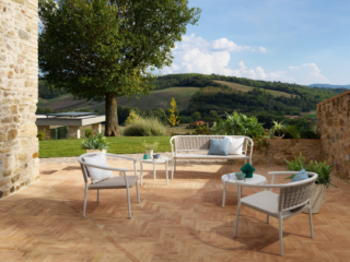 Größen: Sessel 74 x 70 cm Tiefe / Bank 150 x 75 cm / Tische rund D.51 cm x 41 cm Höhe / D.66 cm x 36 cm Höhe