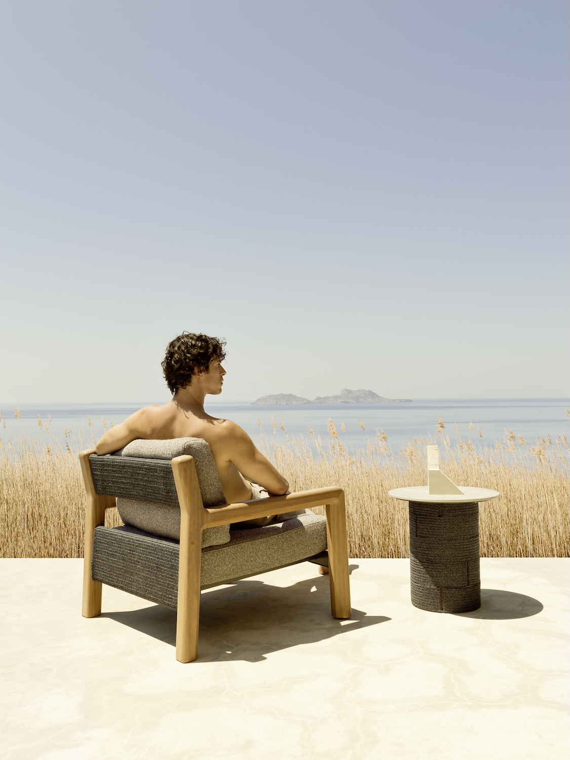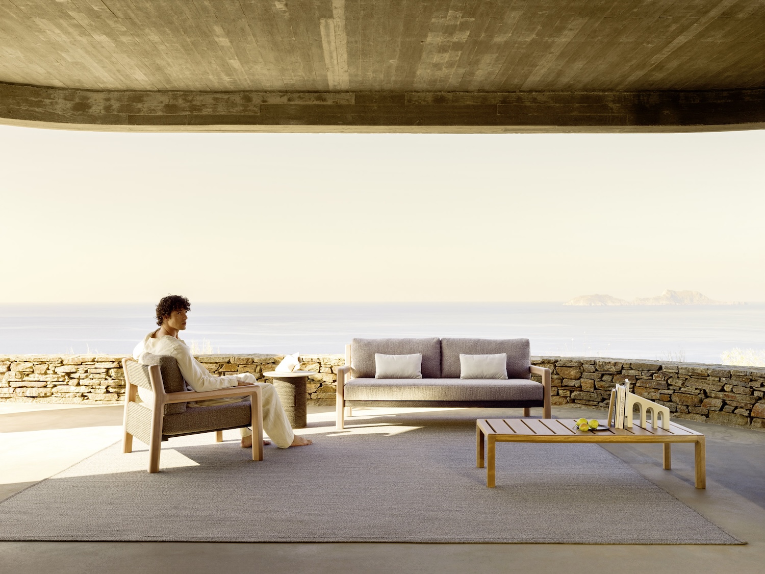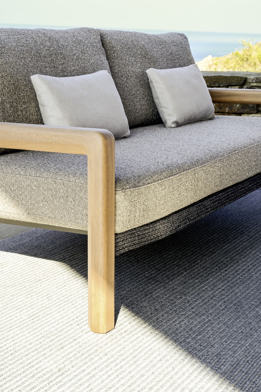 Gestell aus massivem Iroko – Holz mit einer geflochtenen Matte in den Farben desert oder iron.