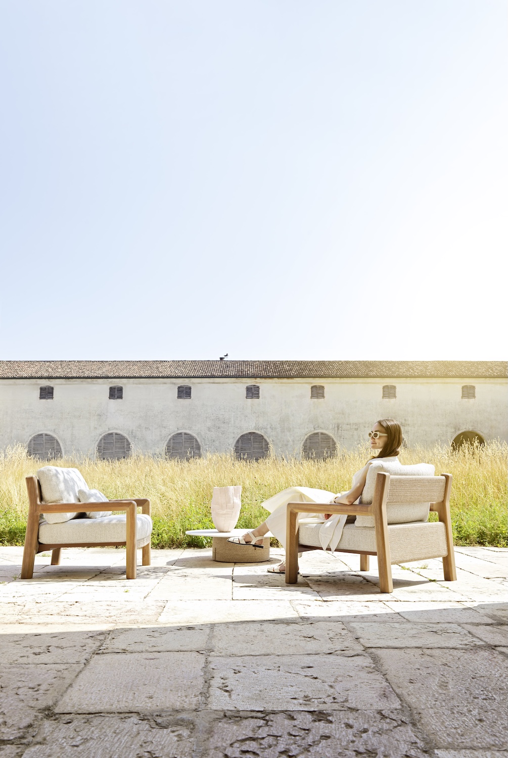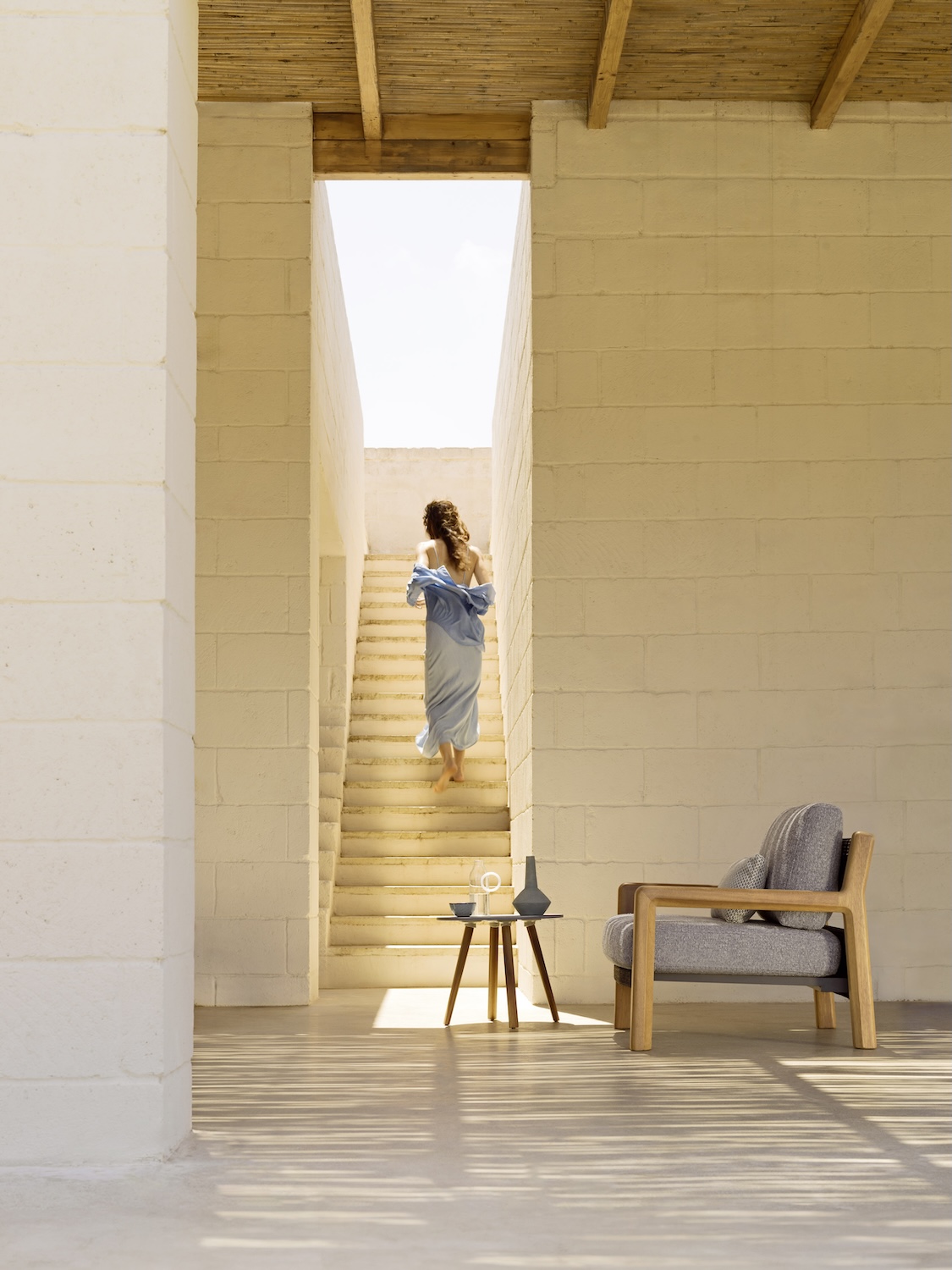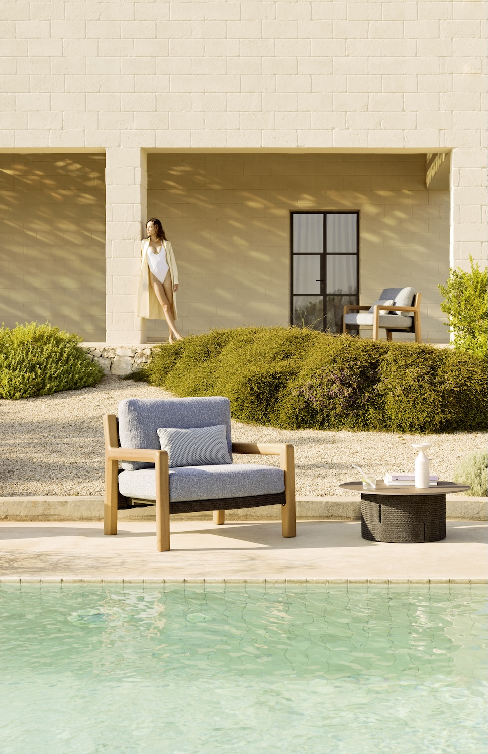 Gestell aus massivem Iroko – Holz mit einer geflochtenen Matte in den Farben desert oder iron.