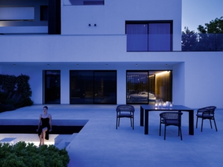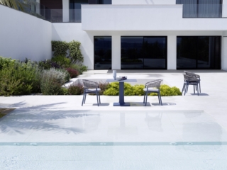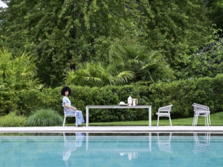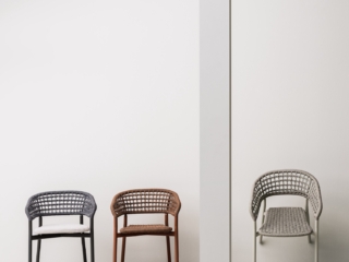 Die Sitzfläche ist geflochten erhältlich oder aus Alu mit Sitzkissen in Farbe nach Wahl. Große Stoffkarte!