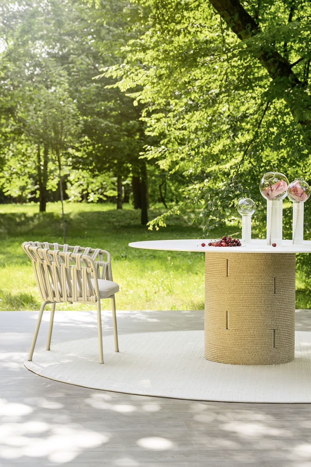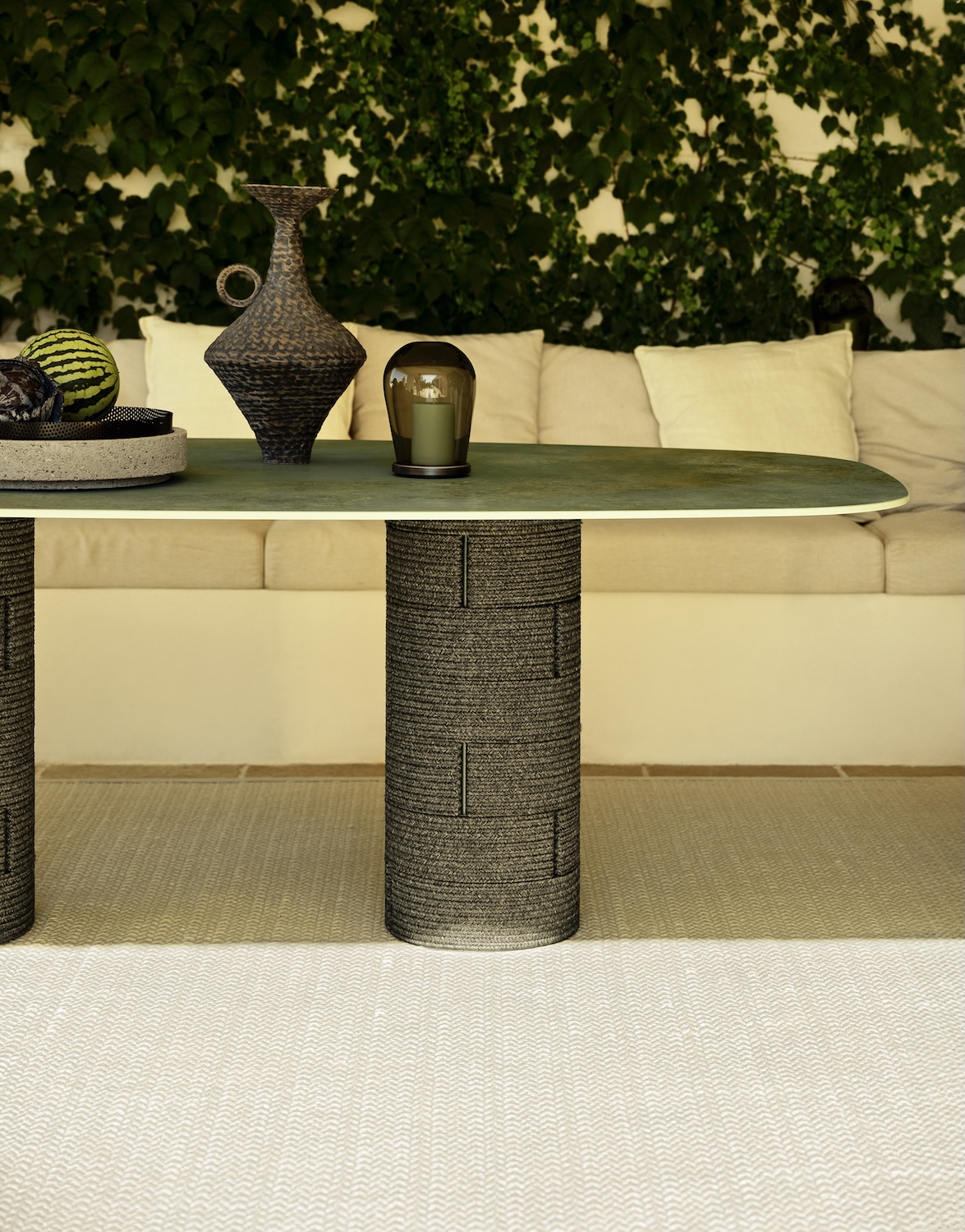 Gestell: Iroko – Holz oder Alu in 9 verschiedenen Farben mit einer geflochtenen Matte in den Farben desert oder iron.